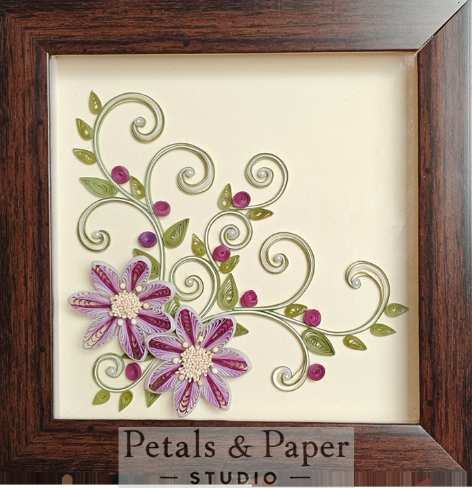 Design: Handcrafted purple and white quilled flowers with pearl centers, green swirled vines, and pink buds