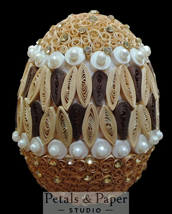 Elevate your home decor with this luxurious brown and gold decorative egg. Expertly handcrafted with meticulous quilling techniques, this egg showcases a harmonious blend of earthy brown tones and elegant gold accents. Adorned with pearl embellishments and shimmering rhinestones, it is a perfect piece for adding sophistication to your living space. Whether displayed as a unique centerpiece or given as a thoughtful gift, this decorative egg embodies timeless artistry and charm.