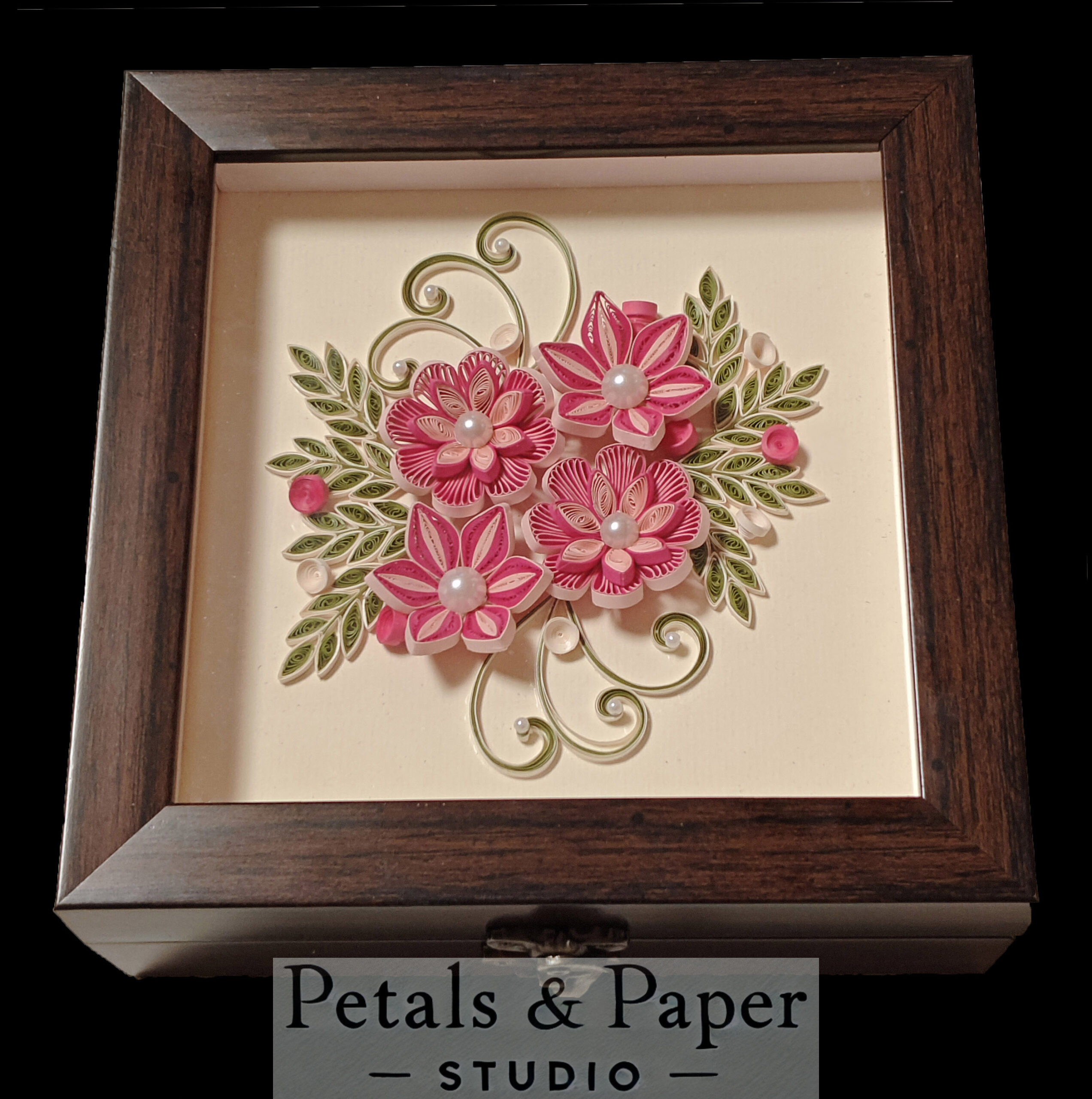 Add a touch of elegance and artistry to your decor with this handcrafted decorative box featuring an intricate quilled floral design. This box is made with premium materials, showcasing delicate pink flowers accented with pearl embellishments and surrounded by lush green quilled leaves. The design is encased in a wooden frame with a smooth finish and glass top, making it perfect for use as a gift box, keepsake holder, or table centerpiece. Its blend of craftsmanship and functionality makes it an ideal gift for special occasions like birthdays, weddings, or anniversaries.