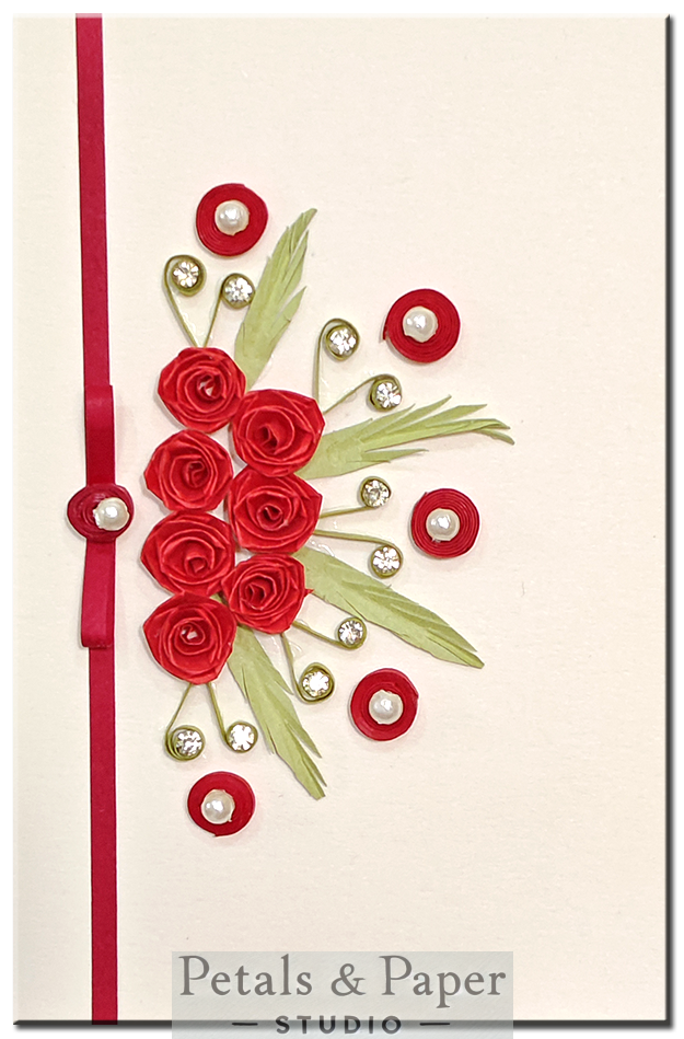 Design: Handmade red quilled roses with rhinestone embellishments and a decorative ribbon accent