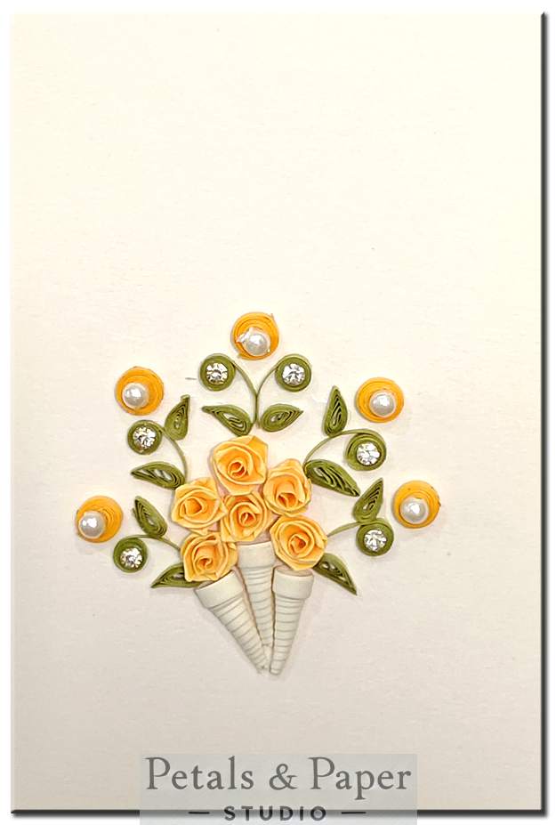 Design: Handmade yellow quilled roses in a bouquet arrangement with pearl and rhinestone accents