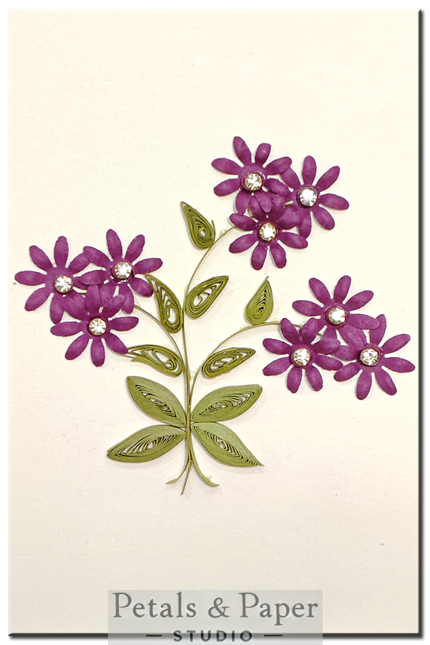 Celebrate special moments with this handmade greeting card, featuring clusters of deep purple quilled flowers with sparkling rhinestone centers and finely crafted green quilled leaves. The elegant floral arrangement offers a timeless charm, making it a perfect choice for birthdays, anniversaries, congratulations, or just sending warm wishes. The card is blank inside, allowing you to personalize your heartfelt message.