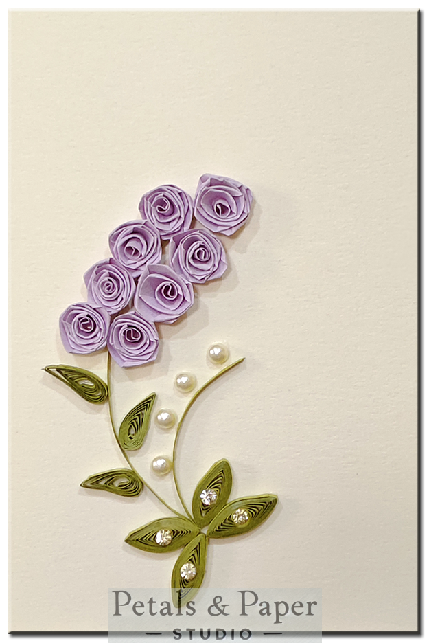 Delicate and charming, this handmade greeting card features a graceful stem of lavender quilled roses with green spiral leaves and a gentle curve of pearl buds. Finished with a star-shaped leafy base accented with rhinestones, this design stands out on a soft cream background—an ideal card for conveying affection, gratitude, or heartfelt wishes.